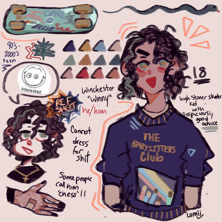 welcome to what i'd like to call 'Acid drop' which is based on a skate move!!the story centers on winchestor 'winny' who's a 18 yr old skater kid who's not the most intellect driven guy. He has a pretty honors student girlfriend who does ballet!! He's suspiciously good at giving advice and he's a pretty smiling airhead otherwise. He's mostly an oc I use to draw and isn't really story driven!!! I just like drawinf male wife n girl boss tropes sue me 😭🤚He hangs out with a crowd that does a lot of dumb and reckless shit but they look out for him so I wouldn't say 'the wrong crowd' but they're not A plus students for sure.It's also centered around the 90's to early 2000's for aesthetic purposes !!! ((More art to be added soon!!))